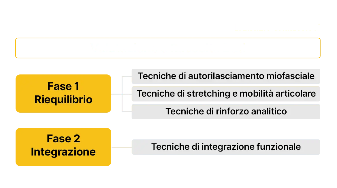 Il Metodo Esercizio Correttivo® si fonda su 3 fasi: Valutazione e Raccolta Dati, Riequilibrio e Integrazione Funzionale. La Valutazione deve necessariamente comprendere un’analisi posturale (sia dinamica, che statica), del livello di attività muscolare, dei range articolari, dell’appoggio podalico e delle classi occlusali e infine di quella che è la storia del soggetto analizzato. Una volta eseguita questa prima analisi si può procedere alla creazione e l’utilizzo di esercitazioni correttive che devono avere come scopo finale quello di correggere l’alterazione lavorando su aspetti più specifici per arrivare a un risultato finale d’insieme.