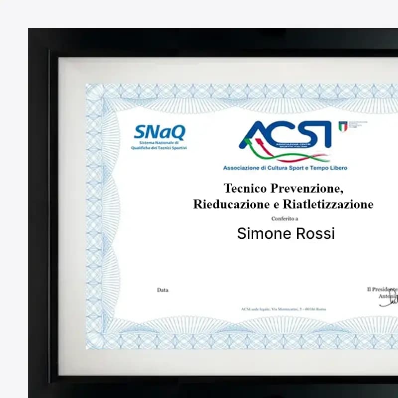 Il diploma e le certificazioni vengono rilasciati al superamento degli esami online e ti consentono di applicare immediatamente le competenze acquisite in prevenzione, rieducazione funzionale e riatletizzazione di sportivi amatoriali, professionisti o soggetti sedentari.