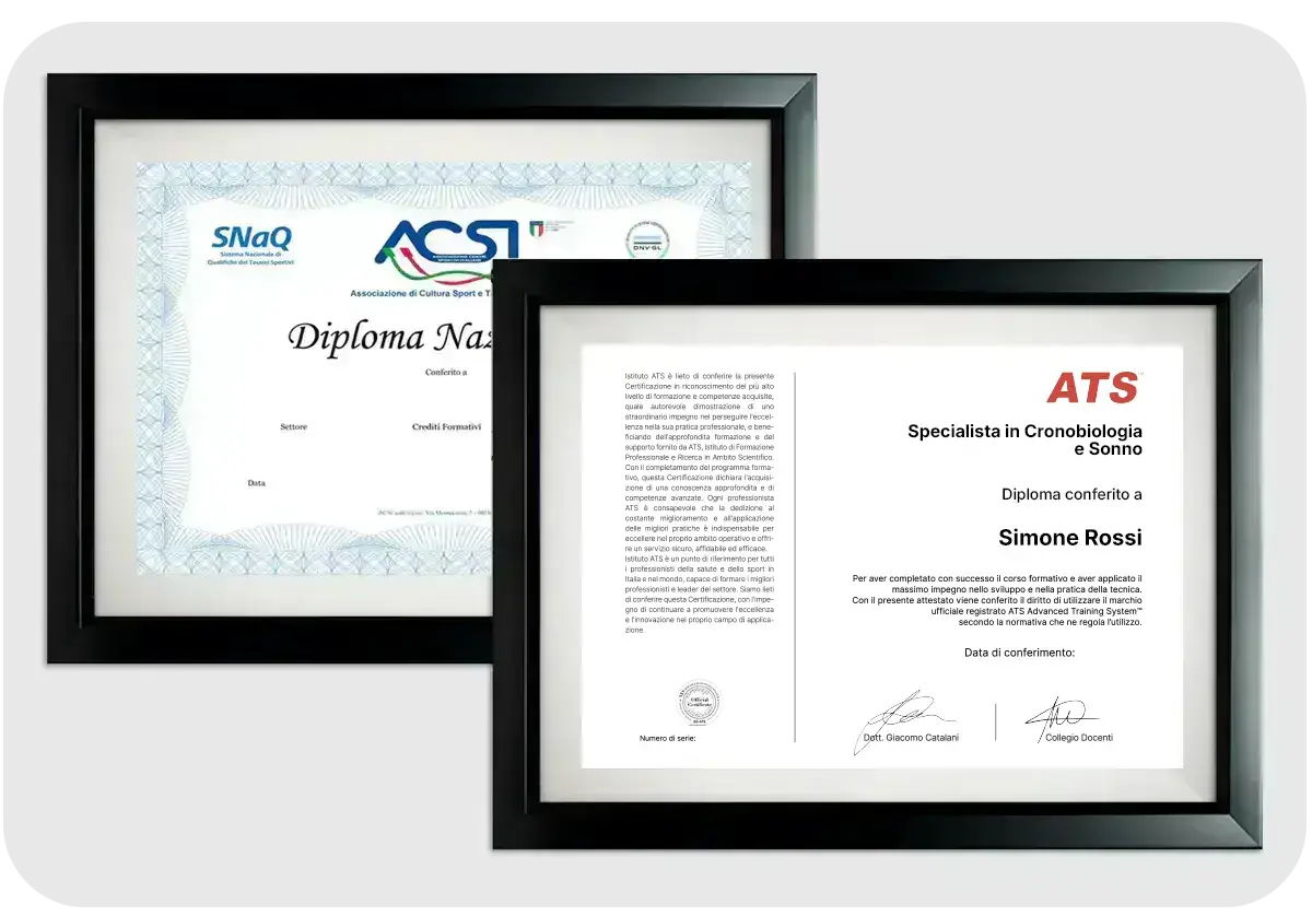ATS è l’unico Istituto a rilasciare il Diploma Ufficiale Specialista in Cronobiologia e Sonno, valida per l’ottenimento del Diploma Nazionale ACSI/CONI e l’accesso al Registro Internazionale dei Professionisti e all’International Sport Science Register.